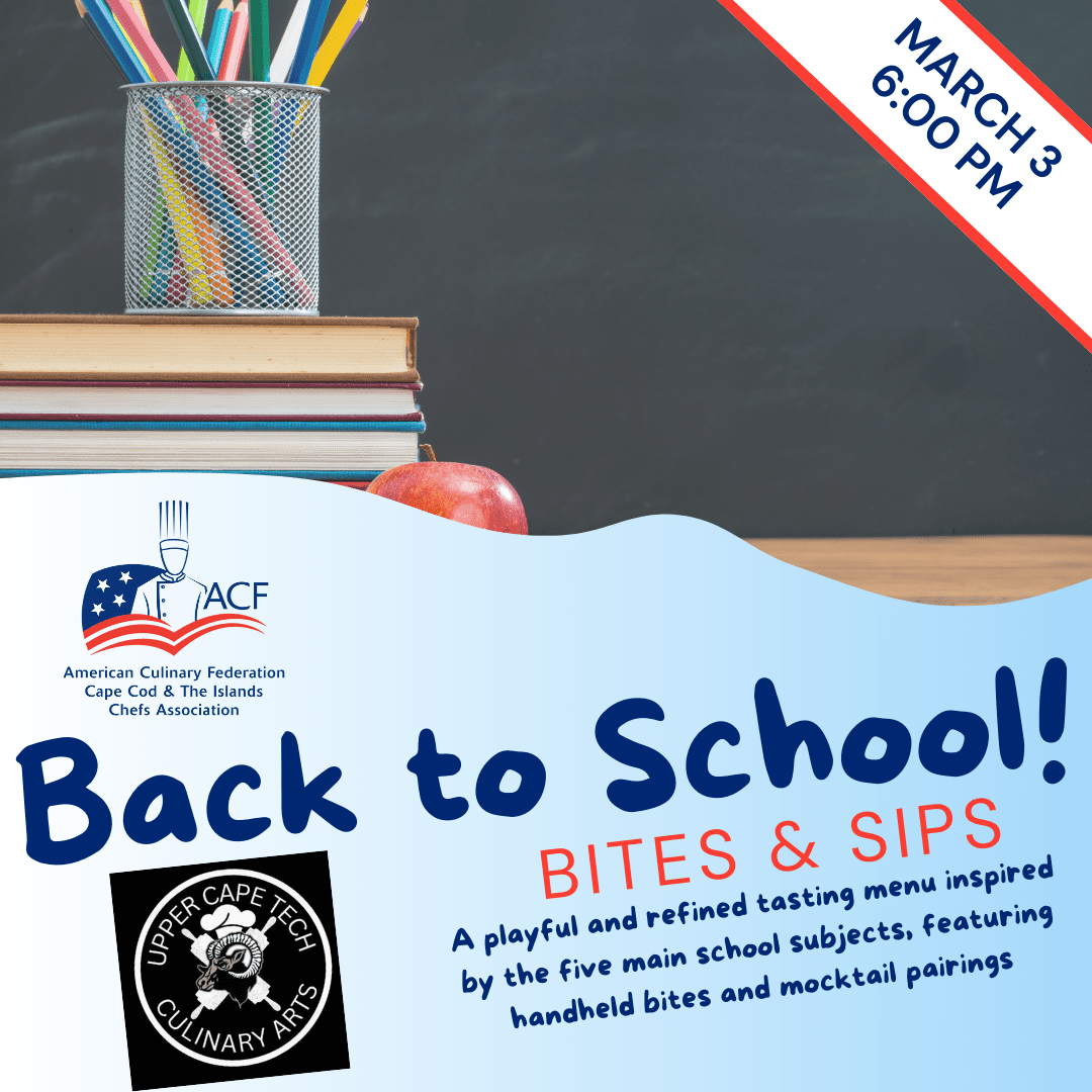 Join us for an evening of school-subject themed bites and sips, as we work our way through the five main school subjects with playful, yet sophisticated, bites created by the talented students in the Upper Cape Tech Culinary Arts program. Each course will also be paired with a mocktail designed and created by the UCT students, as well as a liquid nitrogen sundae bar and homemade uncrustables.