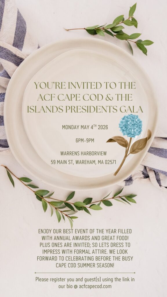 Join us at Warren’s Harborview in Wareham for our 2026 President’s Gala! Enjoy one of our finest events of the year with our annual awards, scholarships, great food, and more! Dress to impress in formal attire and enjoy a delicious meal and a great view. Plus ones are invited and encouraged, so buy your spouses, friends, and family a ticket!